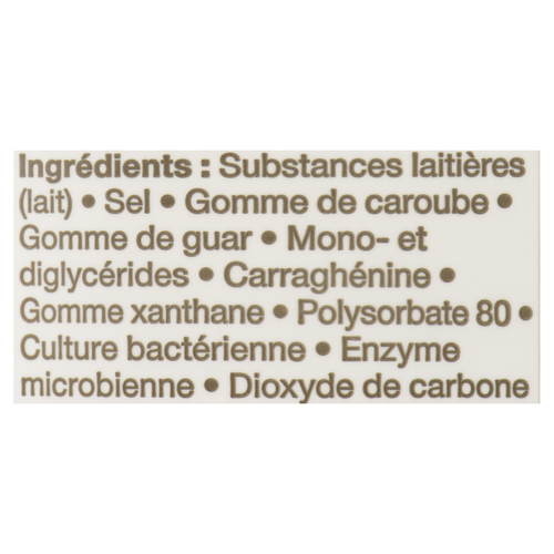 Milk ingredients, Salt, Carob bean gum, Guar gum, Mono- and diglycerides, Carrageenan, Xanthan gum, Polysorbate 80, Bacterial culture, Microbial enzyme, Carbon dioxide