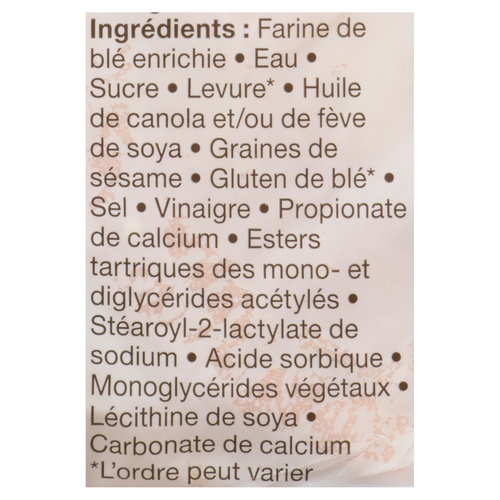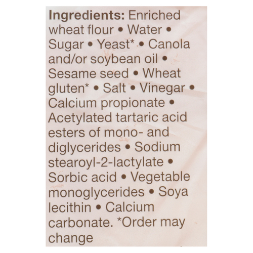 Enriched wheat flour, water, sugar, yeast*, canola and/or soybean oil, sesame seed, wheat gluten*, salt, vinegar, calcium propionate, acetylated tartaric acid esters of mono- and diglycerides, sodium stearoyl-2-lactylate, sorbic acid, vegetable monoglycerides, soya lecithin, calcium carbonate. *Order may change