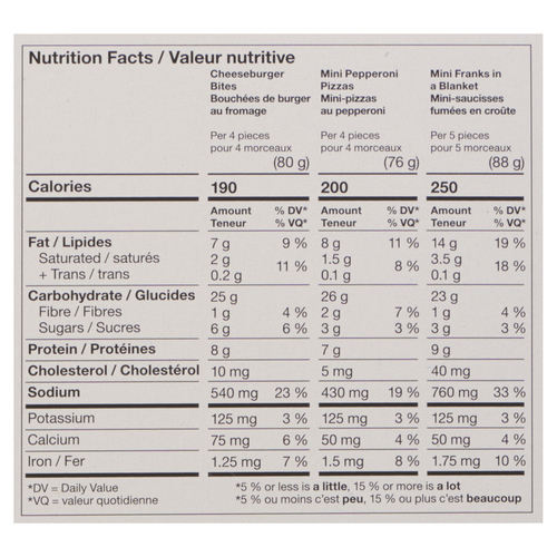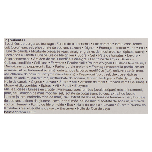 Enriched wheat flour, skim milk, cooked seasoned beef (beef, water, salt, sodium phosphate, flavour), onion, cheddar cheese, milk, water, canola oil, prepared mustard (water, vinegar, mustard seed, salt, spices, sugar), dill pickle, toasted wheat crumbs, sugar, salt, tomato paste, yeast, seasoning, modified corn starch, vinegar, soya lecithin, flavour, modified cellulose, cellulose, enzymes, garlic powder, onion powder, soybean oil.
