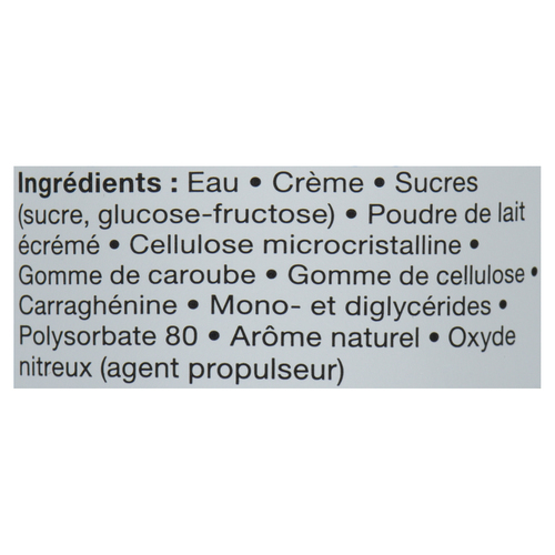 Water, cream, sugars (glucose-fructose, sugar), skim milk powder, cellulose, carob bean gum, cellulose gum, carrageenan, mono- and diglycerides, polysorbate 80, natural flavour, nitrous oxide (pressure dispensing agent)