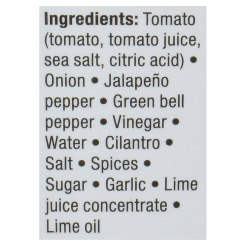 TOMATOES (TOMATO JUICE, TOMATOES, SEA SALT, CITRIC ACID), ONION, JALAPENO PEPPER, GREEN BELL PEPPER, VINEGAR, WATER, CILANTRO, SALT, SPICE, SUGAR, CONCENTRATED LIME JUICE, LIME OIL, GARLIC.